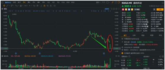 近日,大龙头纸企晨鸣纸业(01812)发布2019年一季度业绩预告,同比94.25%-96.17%的下滑,直接让已经近30多个交易日不断下跌的股价,再度迎来大跌。截止4月15日早盘,晨鸣纸业大跌9.47%,仅半日交易量、成交额达到1075万股、4728万港元,是前一整日交易量的近9.5倍。