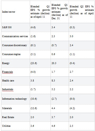 截至上周三下午,标准普尔500指数成份股的505家企业中有25家公布了业绩,综合增长预期为-4.6%,11个行业中有8个预计每股收益将同比下降。这大大低于截至12月31日预计的增幅(3.0%)。