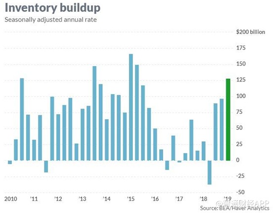 美国官方表示,1季度的增长超出了预期,部分原因是强劲的库存增长。根据政府的数据,本季度新增商品库存320亿美元,折合年率为1280亿美元,推动了GDP增长约70个基点。