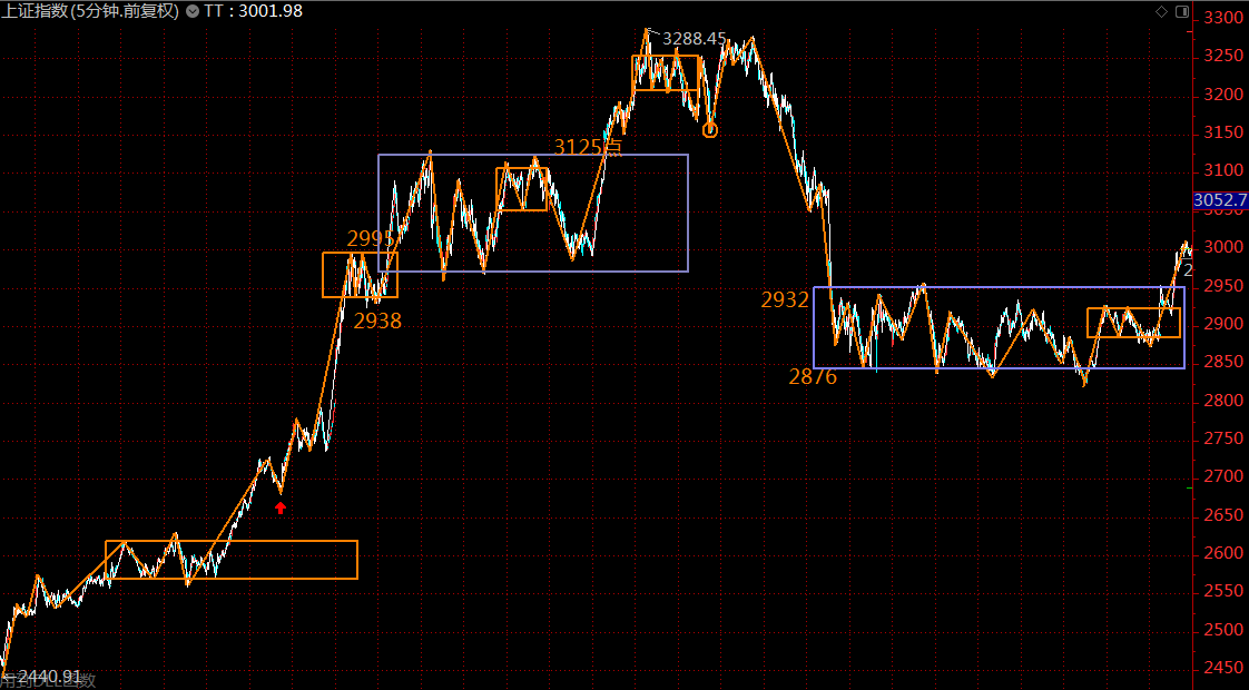 下图为上证指数五分钟级别走势结构。目前已正式突破5月6日开始构建的三十分钟中枢,目前在5分钟的上涨趋势中,未有结束的征兆,投资者宜全力做多,直至出现五分钟上涨趋势背驰为止,按压力位看,大约在3050点附近。风险控制线2932点。