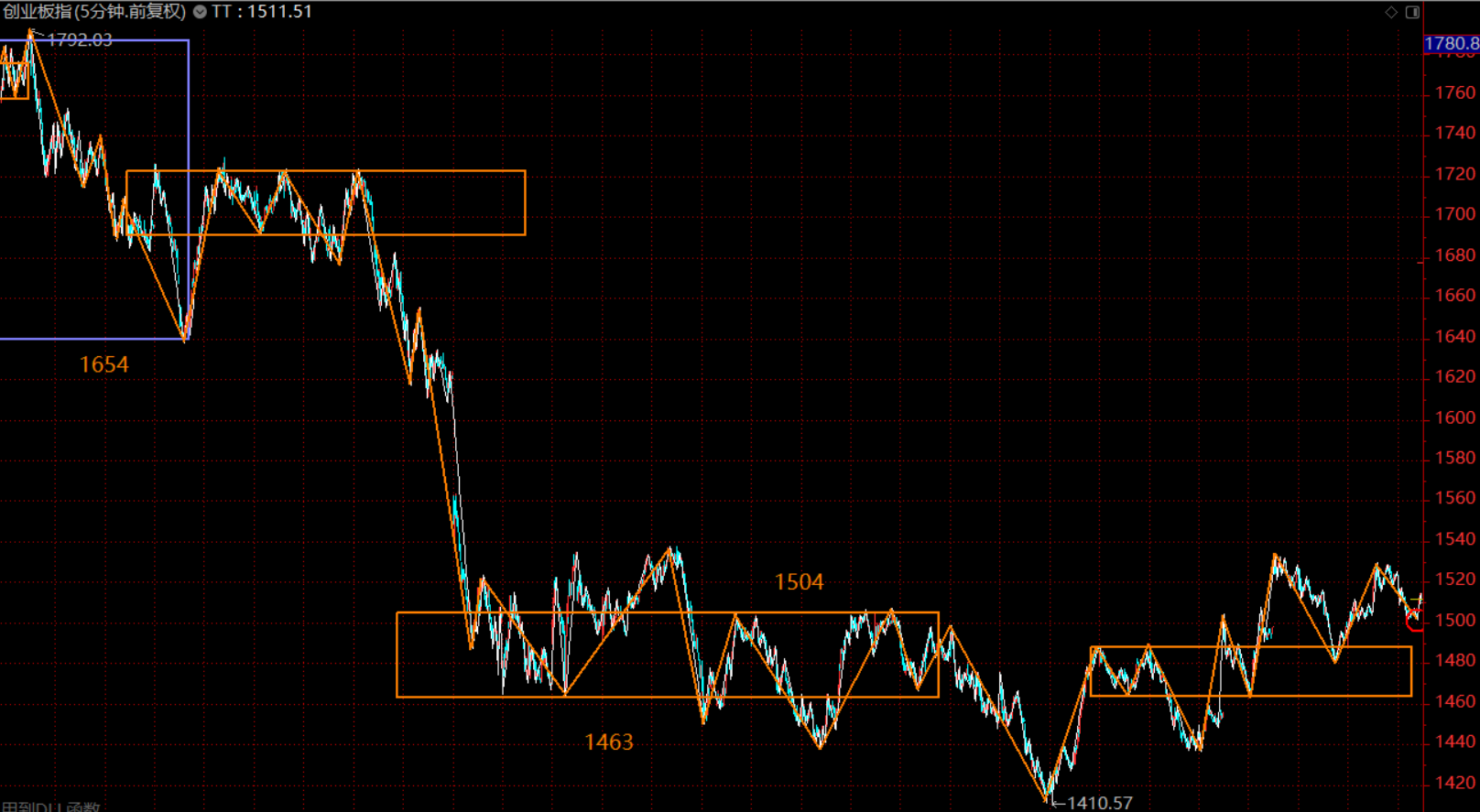 创业板这里未拉离最后一个30分钟中枢(1463-1504),在中枢上轨附近横盘,这里做同级别分解后,红圈圈位置为五分钟级别的第三类买点。因此,综合两个股指,周初市场上涨,后半段需转入防守,逐步缩减仓位,以应对回调。