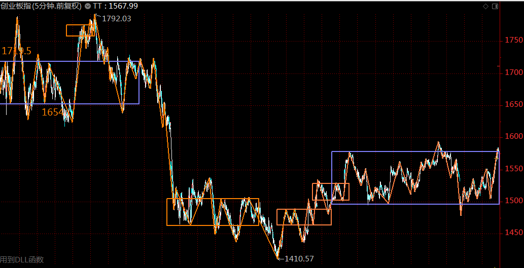 创业板这里走的比主板强势很多,周四的阳线直接修复了形态,目前在三十分钟中枢内部运行,中枢上轨1577点,周五已经顶到了中枢上轨,如果下周能突破此中枢,等五分钟回落线段后构建三买,可大胆介入做多。