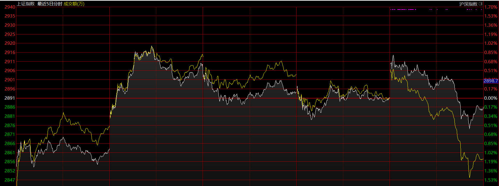上证指数上周在这个位置做中枢扩展,将五分钟上涨的第二个中枢扩展为三十分钟级别的。这是强势的一种表现,市场在震荡中消化抛压。这里需关注大中枢的下轨2845点,跌破后,可能会带来指数的二次探底,这将是绝佳的加仓点位,不跌破则市场随时会上攻2950点。目前态势下,应以持仓为主。