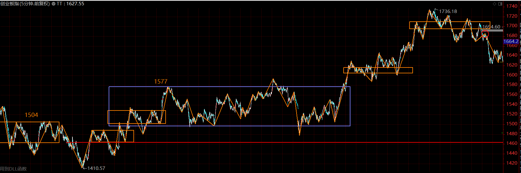 本轮行情的领先指数——创业板指数仍旧为多头排列,目前同样进入了五分钟下跌趋势第二个中枢的构建过程,可依托1600-1620区域展开布局。