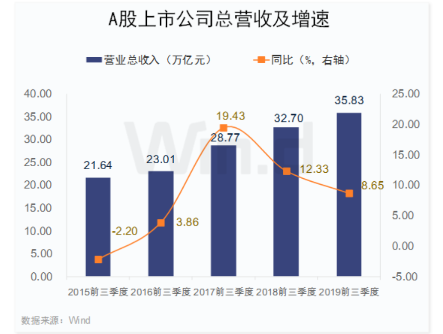 2019年前三季度A股上市公司合计实现营业总收入35.83万亿元,同比增长8.65%;实现净利润(备注:以下统计均为归属母公司净利润)3.19万亿元,同比增长6.77%。