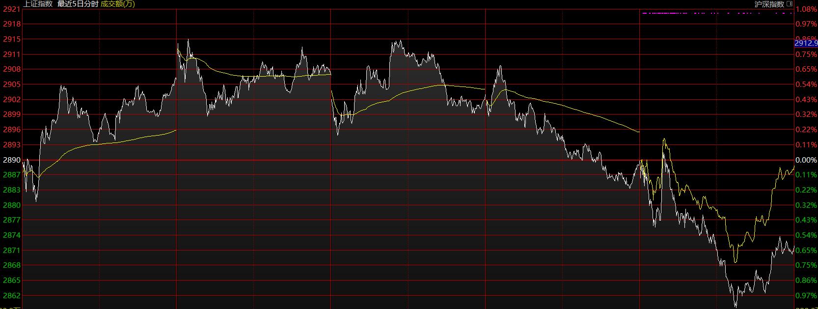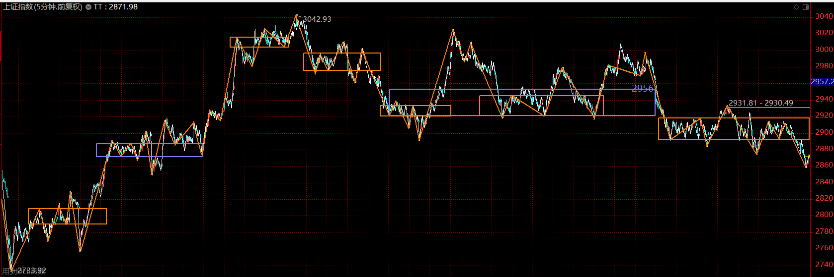 上证指数上周在等待中枢扩展完成后破位下跌,破位力度比较小,而对结构分解后发现,这次大中枢的盘整背驰,第一段以五分钟趋势的形式完成,第二段以盘整的形式完成,且已进入了尾声。因此,料此轮主跌段不会太久,继续维持在前序中枢下轨2850附近企稳的判断。