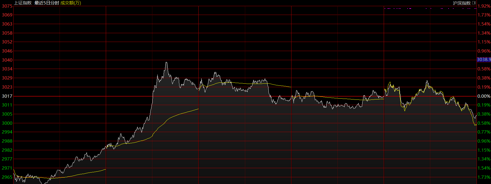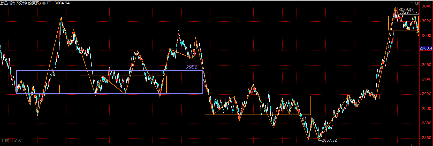 目前分析只需集中于这个五分钟的上涨趋势即可,上周如期做出了五分钟上涨趋势第二个中枢的雏形。前面几天表现其实蛮超预期的,特别是科技股的逼空,A股似乎许久未见了。核心问题出在周五,周五有两个点显示出当下市场的外强中干,第一个在于周五早盘南京证券反包涨停时,市场资金的失衡,明显看出科技股与券商股两台“抽水机”从前几天的互相配合变成了互相伤害;这一段跳水直接将图形破坏,强度大的新高背驰可以说已经没有了,那下午上拉无力后的跳水也就在情理之中。