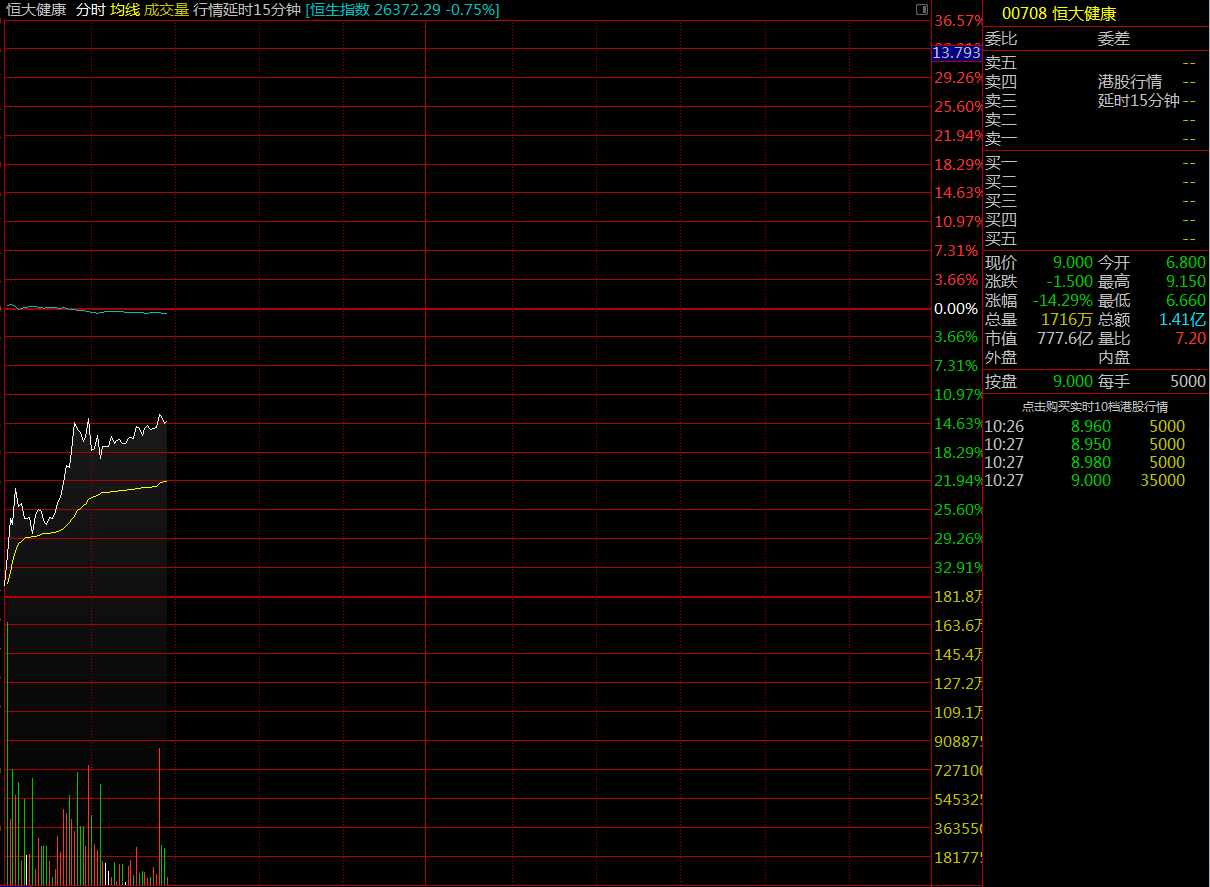 智通财经APP获悉,恒大健康(00708)今日复牌,盘前股价下跌,截至9时20分,跌35.24%,报价6.8港元,成交额299.2万。