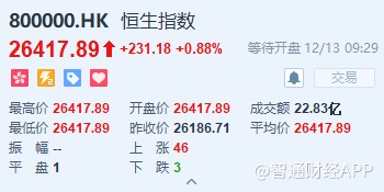 恒生指数开盘涨0.88%,报26417.891点。国企指数涨0.83%,报10504.04点。红筹指数涨0.95%,报4347.83点。大市盘前成交22.83亿港元。