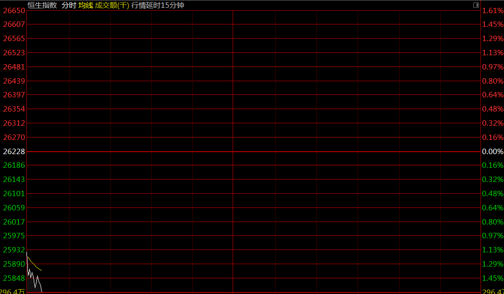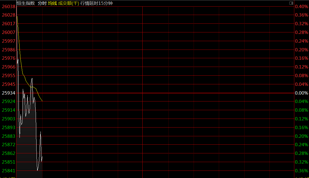 恒生指数开盘跌1.15%,报25925.09点。国企指数跌1.2%,报10575.62点。红筹指数跌0.75%,报4255.89点。大市盘前成交17.25亿港元。
