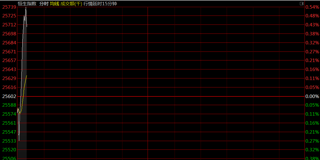 恒生指数开盘涨0.32%,报25874.36点。国企指数涨0.24%,报10503.81点。红筹指数涨0.44%,报4250.64点。大市盘前成交17.33亿港元。