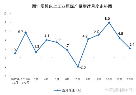 国家统计局今日(1月21日)公布了2018年12月份能源生产情况,数据显示,12月份原煤产量3.2亿吨,同比增长2.1%,增速比上月回落2.4个百分点,创下逾三年来最高,因冬季需求旺盛推动主要矿商增加生产,且一些新矿也开始上马。