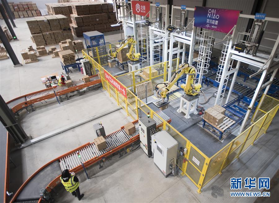 近日,在菜鸟网络武汉黄陂物流仓内,一组机械臂在进行搬运作业。近日,菜鸟网络在湖北武汉黄陂物流仓库启用智能机械臂来搬运商品。