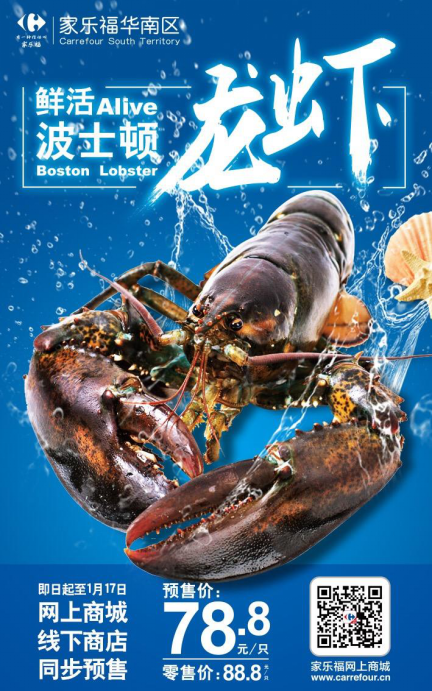 “波士顿龙虾”于1月18号本周四,在家乐福深圳/东莞/惠阳门店鲜活开售。门店3km范围内,18号当天配送到家,只为给你全方位的私厨体验。
