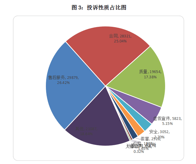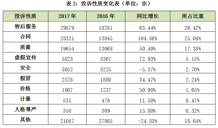 2017年,消费者反映最突出的投诉性质分别是售后服务29879宗,占26.42%;合同28321宗,占25.04%;质量19654宗,占17.38%;三大性质类别的投诉占比都超过了15%。