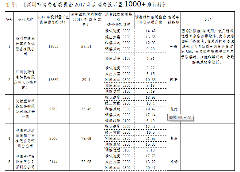 附件:《深圳市消费者委员会2017年度消费投诉量1000+排行榜》
