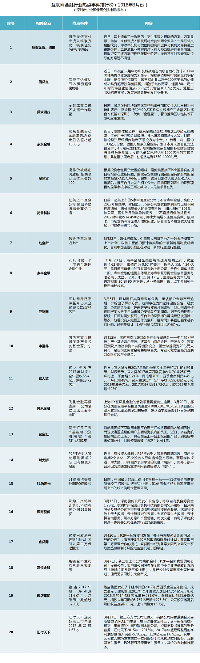 互联网金融行业热点事件排行榜榜单说明:本榜单主要通过计算机系统对舆情数据的自动采集、整理和分析,结合舆情分析师的筛选和研判,对2018年3月1日至3月31日这一时段内互联网金融领域的热点舆情事件(主要是涉企舆情)作出综合评估而得。主要评估指标包含新闻报道指数、微博扩散指数、论坛参与指数和境外炒作指数,在上述指标基础上,根据相关算法得出事件综合影响力指数,按照指数大小进行排序。