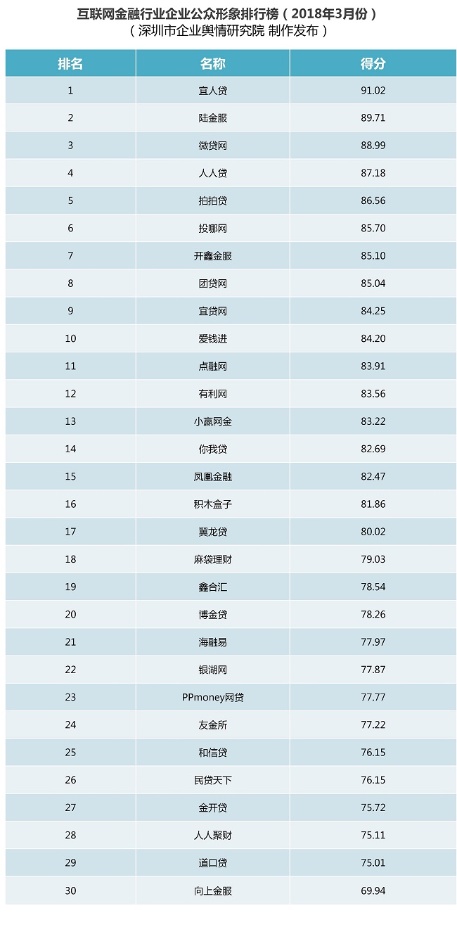 互联网金融行业企业公众形象排行榜:本榜单根据公开可查的信息、数据,从规模实力、合规性、交易金额、信披透明度、舆论曝光度和负面影响等六个维度,对2018年3月1日至3月31日这一时段内互联网金融行业各企业的公众形象进行综合评估并排名,旨在对互联网金融行业各企业开展品牌形象塑造、宣传推广策略、公共关系维护、品牌影响力等方面的综合评价,既帮助相关企业找准合适的品牌定位、发展方向,也为消费者和投资者提供科学、公正、独立的消费和投资决策参考。