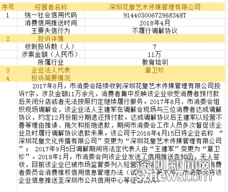 2017年8月,市消委会陆续收到深圳花皇艺术传媒管理有限公司投诉7宗,涉及金额11万余元,消费者集中反映该企业收受消费者预付款后关闭分店或者无法按照约定继续履行服务。2017年8月,市消委会组织现场调解会,该企业法人王建军在调解会现场与三位消费者达成调解协议,约定12月份前分期退还预付款。达成调解协议后王建军以经营不善等理由推诿、拖欠和拒绝退款,期间市消委会工作人员多次督促该企业及时履行调解协议退款未果。该公司于2016年4月15日将企业名称 “深圳花皇文化传播有限公司”变更为“深圳花皇艺术传媒管理有限公司”; 2017年9月5日调解期间将法定代表人由“王建军”变更为“章卫珍”。2018年1月,市消委会向该企业发送了信用推送告知函,无人签收,目前该企业已被市场监管委列入经营异常名录。依据《深圳市消费者委员会消费维权信用信息管理办法(试行)》第九条,市消委会将该企业信息推送至深圳市公共信用中心等征信机构。该企业虽然变更了公司名称和法定代表人等公司信息,但仍需承担原企业未履行的法定或约定义务。