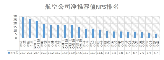 在本次调研中,20个航空公司品牌整体的平均净推荐值为14.2分。排名第一的是深圳航空,净推荐值为28.7分;其次是四川航空,净推荐值为26.1分;第三名是中国东方航空,净推荐值为23.4分。