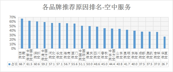 空中服务推荐率排名:排名前三的是西藏航空、中国联合航空、深圳航空;