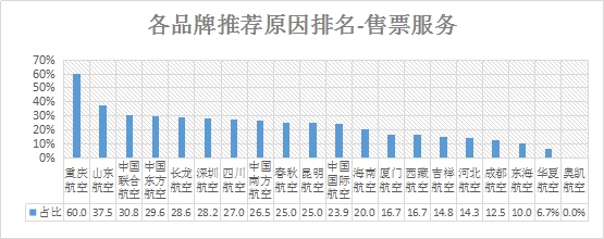 售票服务推荐率排名:排名前三的是重庆航空、山东航空、中国联合航空;