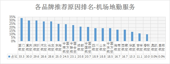 排名第一的是厦门航空,机场地勤服务推荐率为33.3%;其次是重庆航空,推荐率为30.0%;第三名是深圳航空,推荐率为29.6% 。