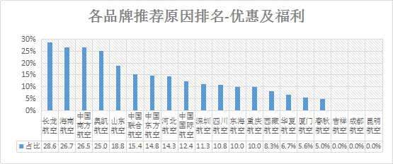 优惠及福利推荐率排名:排名前三的是长龙航空、海南航空、中国南方航空。