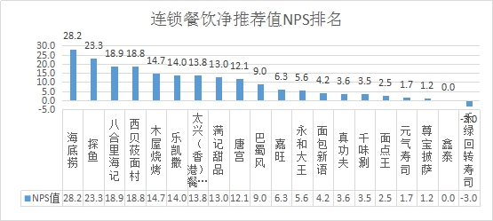 在本次调研中,20个连锁餐饮品牌包括三类:中式正餐(海底捞、探鱼、八合里海记、西贝筱面村、木屋烧烤、太兴(香港)餐厅、唐宫、巴蜀风、千味涮)、中式快餐(嘉旺、永和大王、真功夫、面点王)、特色餐饮(乐凯撒、满记甜品、面包新语、元气寿司、尊宝披萨、鑫泰、禾绿回转寿司)。整体的平均净推荐值为9.4分。排名第一的是海底捞,净推荐值为28.2分;其次是探鱼,净推荐值为23.3分;第三名是八合里海记,净推荐值为18.9分。