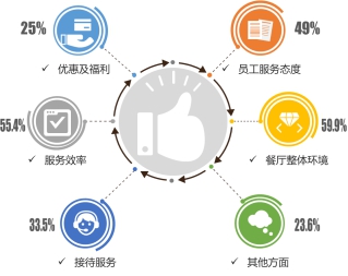 本次调查从餐厅整体环境、服务效率、员工服务态度、接待服务、优惠及福利及其他方面等六个维度展开,其中餐厅整体环境与服务效率是消费者最主要推荐的原因,餐厅整体环境推荐比例最高,为55.9%。