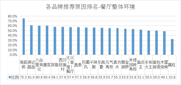 餐厅整体环境推荐率排名:排名前三的是海底捞、满记甜品、八合里海记;
