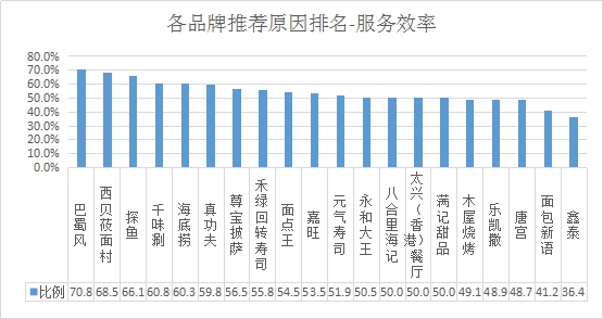 排名第一的是巴蜀风,服务效率推荐率为70.8%;其次是西贝莜面村,推荐率为68.5%;第三名是探鱼,推荐率为66.1%。