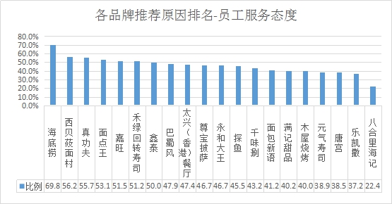 员工服务态度推荐率排名:排名前三的是海底捞、西贝莜面村、真功夫;