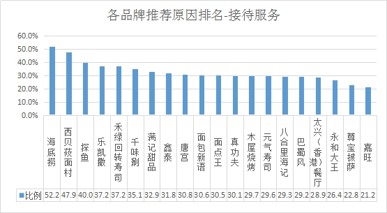 接待服务推荐率排名:排名前三的是海底捞、西贝筱面村、探鱼;