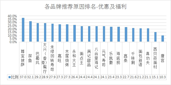 排名第一的是尊宝披萨,优惠及福利推荐率为37.0%;其次是探鱼,推荐率为32.1%;第三名是巴蜀风,推荐率为29.2%。