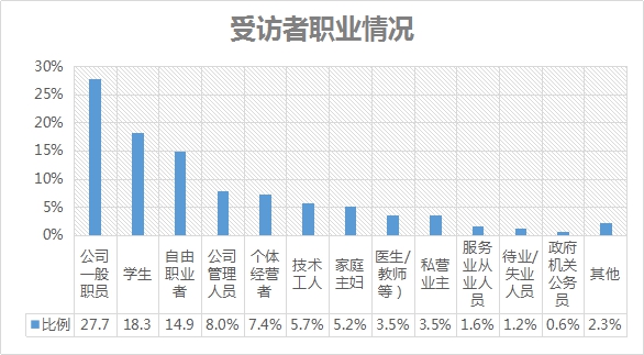 本次调研中,公司一般职员的比例最高,为27.7%,其次是学生,占比为18.3%。53.9%的受访者其个人月收入超过5000元。