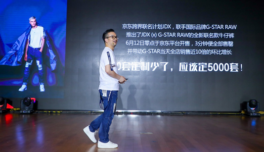 图:京东时尚生活事业群总裁胡胜利身着JDX (x) G-STAR RAW京东跨界联名环保牛仔裤及联名T恤