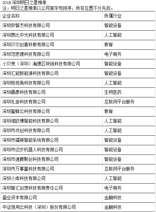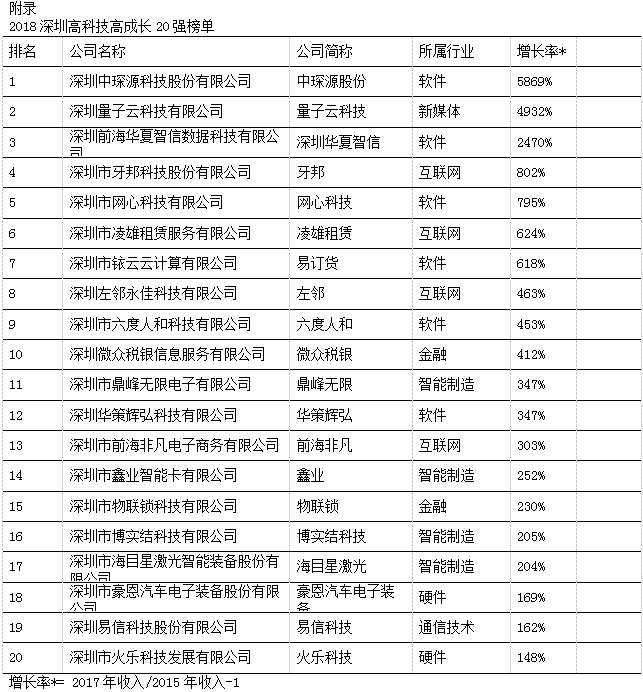 今年,荣登“深圳20强”三甲的获奖企业分别为深圳中琛源科技股份有限公司、深圳量子云科技有限公司和深圳前海华夏智信数据科技有限公司,他们在过去三年中表现出的平均增长率分别为5,869%、4,932%和2,470%。本年度入选“深圳20强”的企业除了软件、硬件、互联网和通讯技术外,也不乏其他新兴领域,如新媒体、智能制造和金融科技。此外,为表彰深圳市当地表现优秀且极具潜力的初创企业,今年共有20家企业获选“深圳明日之星”,它们来自多个不同的领域,包括人工智能、智能设备、电子商务、教育、生物医药、金融科技和互联网平台服务等 (详见附录)。获选成为“深圳20强”和“深圳明日之星”的企业,将自动成为“中国高科技高成长50强”(简称“中国50强”)和“中国明日之星”的候选企业,并在今年11月与全国其他入围企业角逐,跻身全国增长最快、最具发展潜力的高科技企业之列。