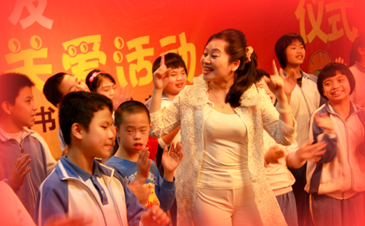 十年坚持义务为盲童教唱的爱心艺术家郑海燕与盲童在一起