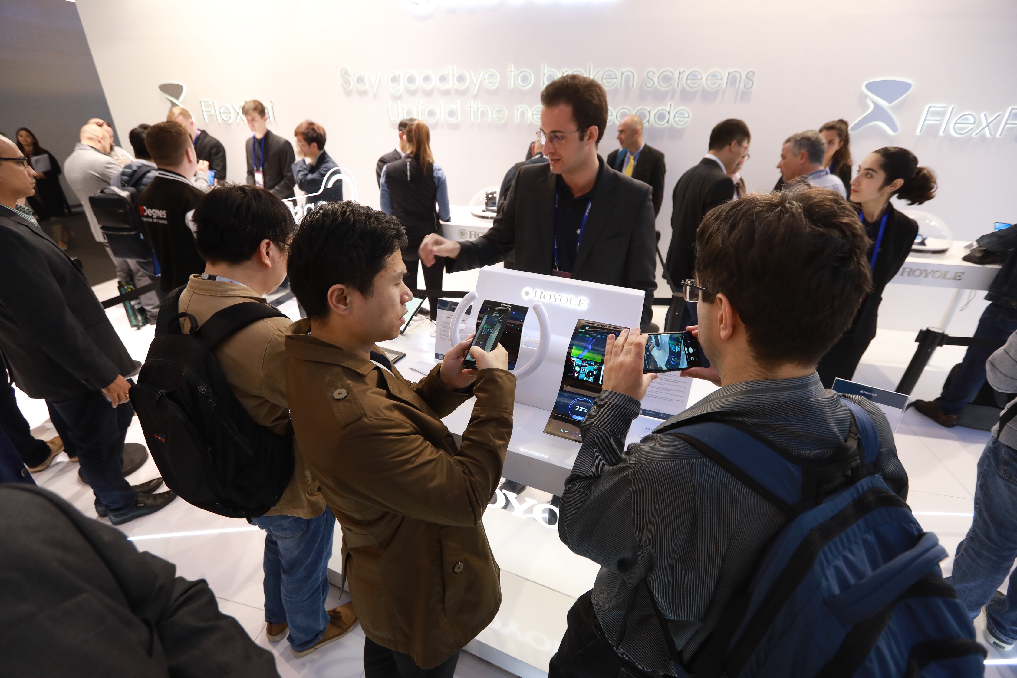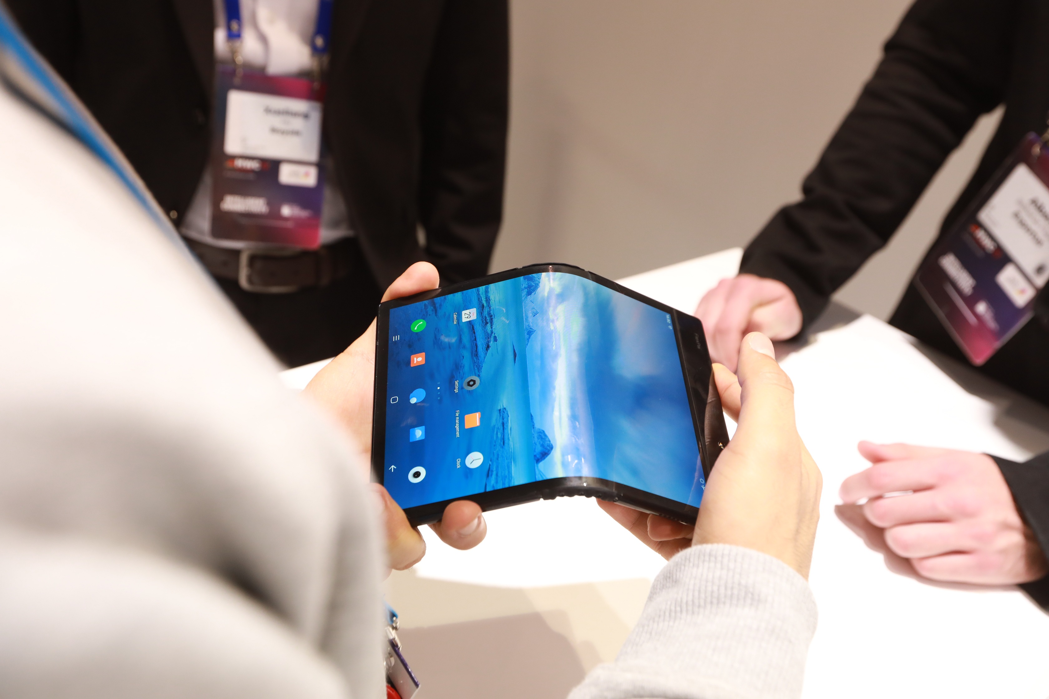 折叠屏手机作为今年MWC的热点之一。柔宇科技现场展出一大批全球首款可折叠柔性屏手机FlexPai柔派,没有玻璃柜紧锁,没有高大安保人员严密看管,参展客户可在柔宇展位随意上手体验折叠屏手机柔派的多种功能,多次折叠、镜像拍照、大屏游戏等等均可自由尝试。