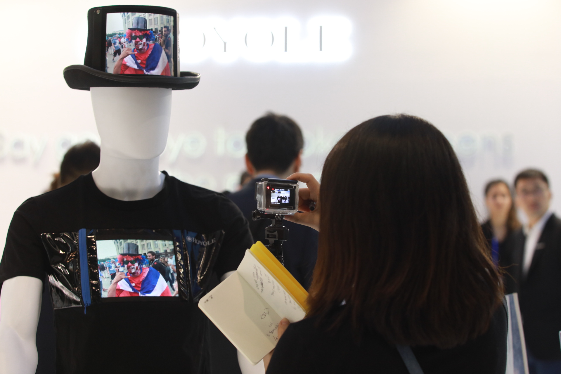 法国一女士体验高清柔性屏时尚衣帽后对柔宇工作人员说:"柔性屏时尚衣帽套装超酷,这个如果能穿去派对的话就太完美了。"