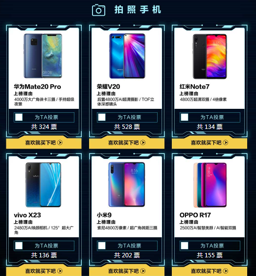 在手机类产品投票中,拍照手机候选产品分别为:华为Mate20 Pro、荣耀V20、红米Note7、vivo X23、小米9和OPPO R17,截至3月12日荣耀V20暂时领先。