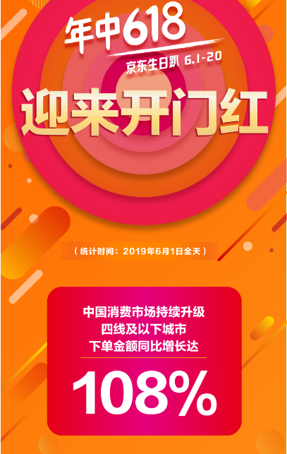 深圳新闻网2019年6月3日讯 6月1日零时刚过,京东后台销售数据显示订单量就呈现出井喷状态,一年一度的京东618全球年中购物节正式开启。京东大数据显示,6月1日全天四线及以下城市下单金额同比增长达108 %。