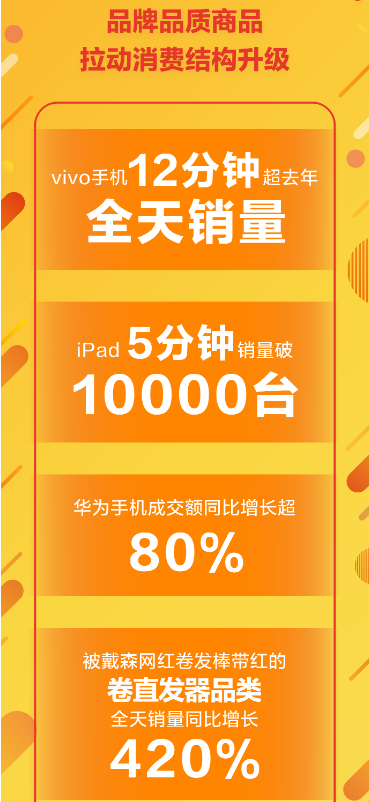 作为传统优势品类,手机在今年618年中购物节首日的表现仍旧抢眼。vivo手机12分钟超去年全天销量,最终全天的销量达到去年同期的11倍;华为手机成交额同比增长超80%,华为手机配件成交额同比增长超300%; iPad在5分钟的销量就突破万台。