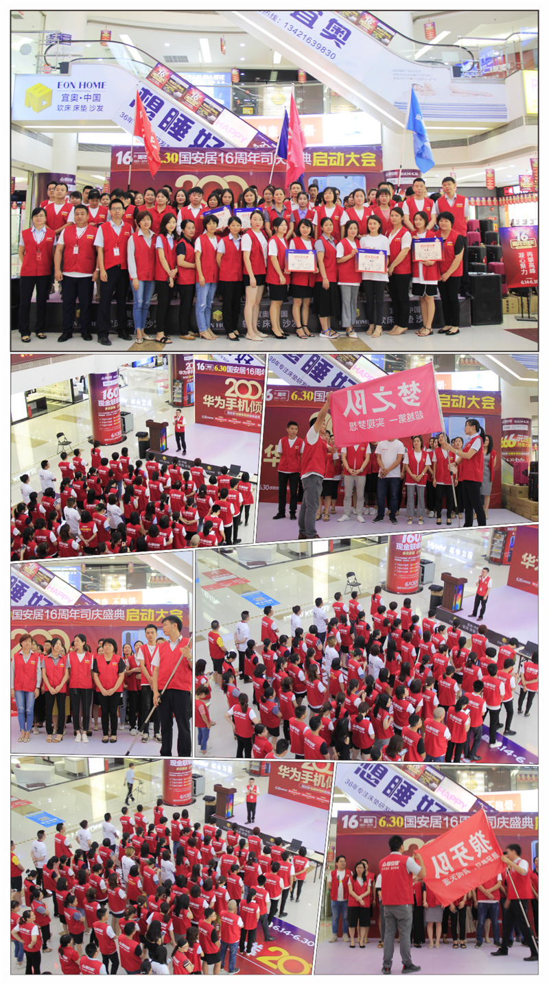 6月13日-14日,国安居“16周年司庆”启动大会在国安居深惠门店火热举行,800家品牌商家的销售精英、员工代表、热心市民等近万余人共同见证了这一意义非凡的时刻。参与者身着统一服装,早早就聚集在商场中庭,所有人都把笑容挂在脸上,展现出自己最阳光、最开心、最具活力的一面。