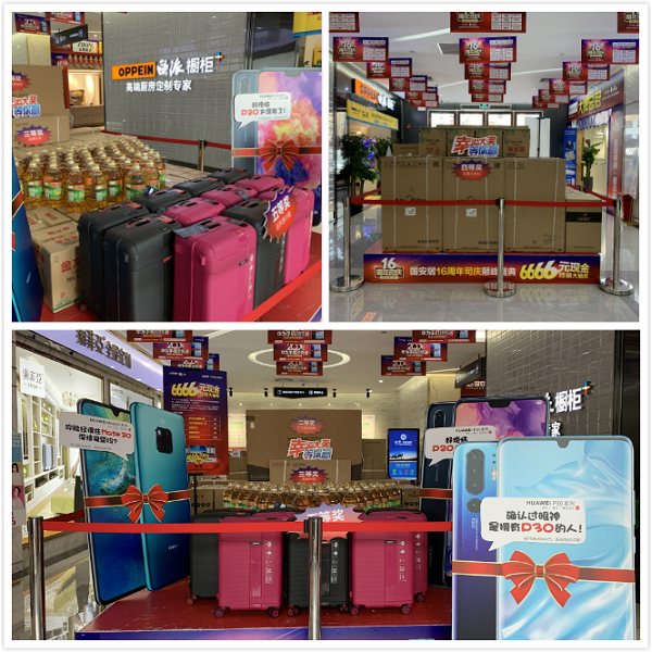 据了解,这场从6月14日持续至30日的司庆活动,国安居为业主朋友们准备了六大钜惠:1、司庆重磅献豪礼,七店就送200台华为手机!6.30当天累计订单(可多个品牌下定)实付满15000元送远东旅行箱一个,实付满80000元送华为P20一台,实付满150000元送华为mate20一台,实付满250000元送华为P30手机一台;2、6月30日前,提前在国安居店面及微信16元抢购《司庆超抵卡》,活动当天签到即可尊享6重超值豪礼;3、6月14日-6月29日活动期间,顾客买单后微信分享活动,即可领取16-666元随机金额现金红包一个,5000个现金红包等您来瓜分!还有机会赢取终极大奖华为P30哦;4、国安居16周年司庆公益义卖,惊现160元马桶、160元炉灶、16元花洒、16元鞋柜……买到就是赚到!没错,就是这么任性;5、160万现金联单就返,6月30日活动当天,在国安居下定3个品牌以上(每个品牌实付满3000元),即可参与联单返现活动,多买多返,上不封顶;6、终极抽6666元现金大奖,6.15-6.30活动期间,购物实付金额满2000元可领取抽奖券一张,满4000元领取两张,以此类推。