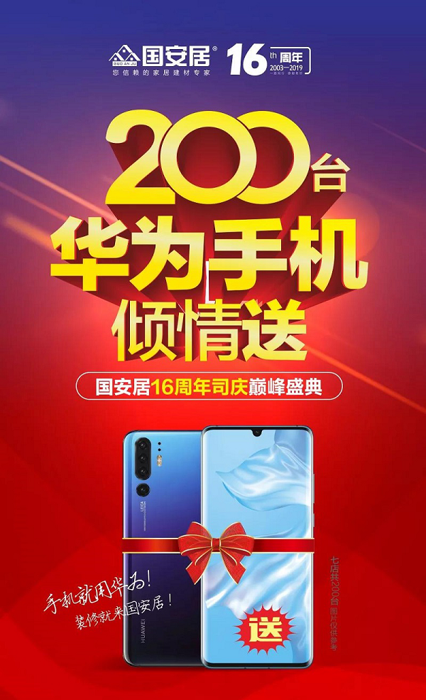 时光有限,坚持无限,国安居16年里始终如一的坚持做着一件事情:顾客至上,服务第一,诚信为本!为回报广大家居消费者一直的厚爱,国安居深惠七店在此16周年之际,携手旗下1000余家一线大牌举行“16周年司庆巅峰盛惠,200台华为手机倾情送”大型促销活动。