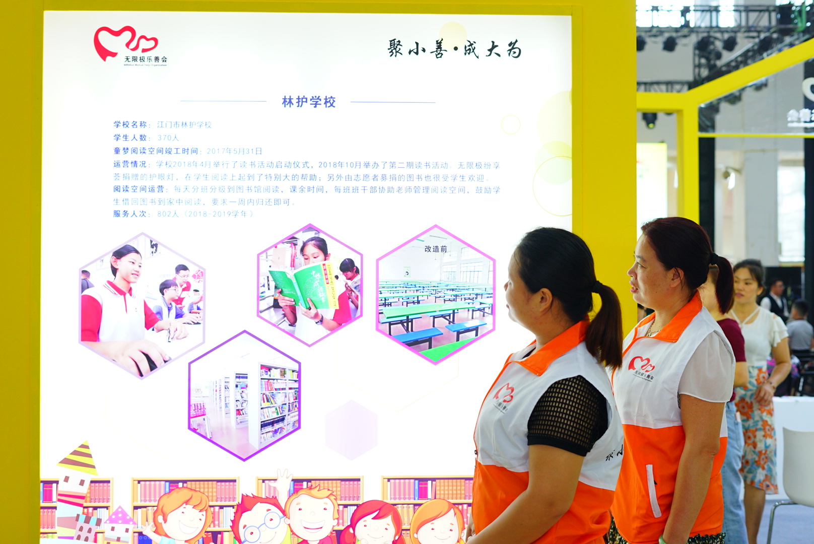 在南国书香节江门分会场的场馆中央,“黄色小屋”尤其吸人眼球。在项目展示上,无限极乐善会多年来一直关注乡村儿童的阅读教育问题,自2015年起,携手江门市相关政府部门发起了童梦阅读空间公益项目,致力于儿童阅读空间建设及校内阅读推广工作。在展区,可以看到五所童梦阅读空间的运营等基本情况。
