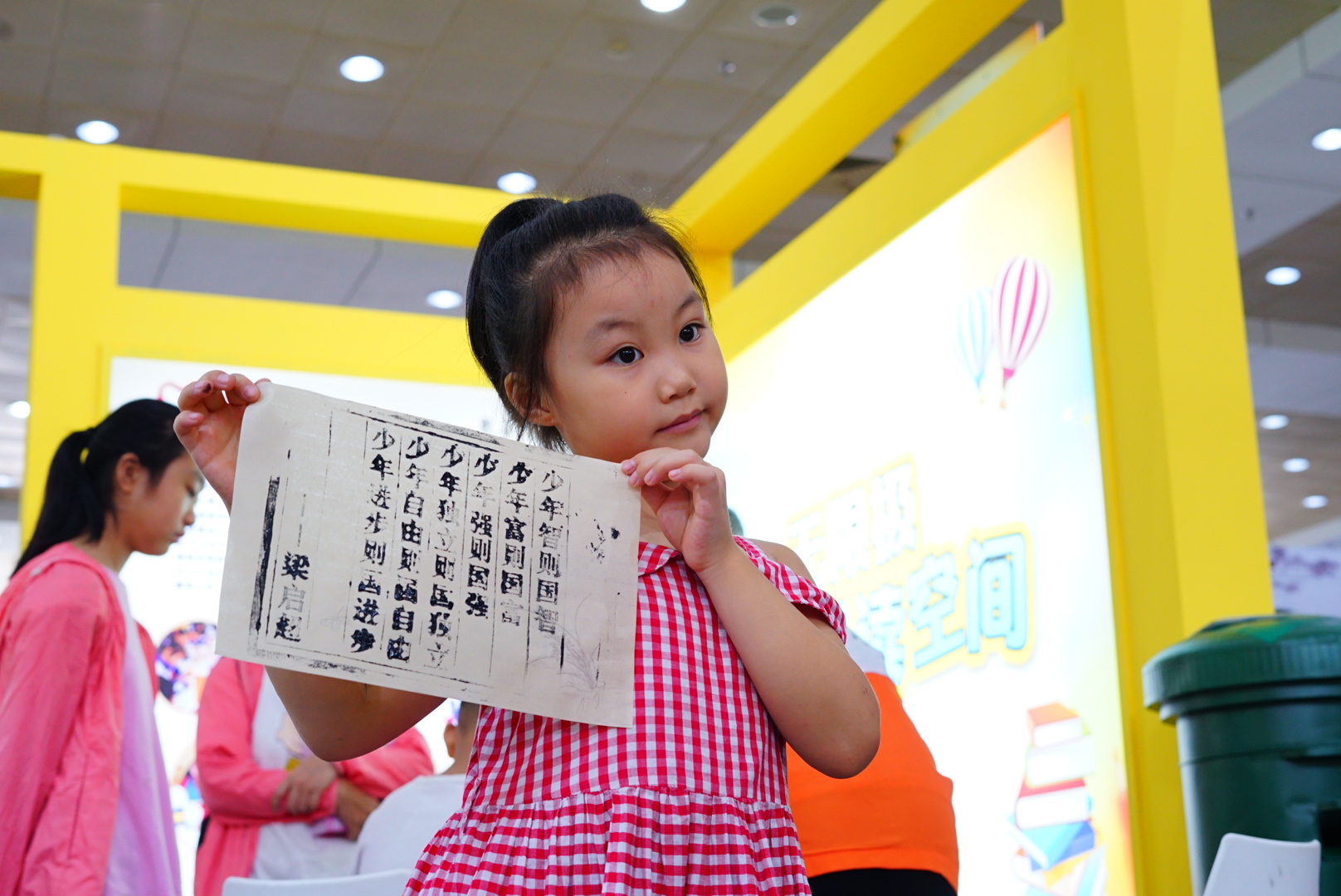 有了一系列视觉冲击,现场还鼓励大家动动手,“活字印刷”区和“手工布书”体验区也是不容错过。体验涂墨、拓压等工序,活字印刷术听就听得多了,小朋友见还是第一次见,还有机会亲自体验一番,感受浓浓书香氛围。印刷的内容节选自江门籍思想家、教育家梁启超的爱国散文《少年中国说》。