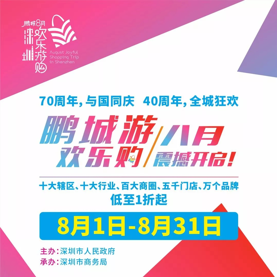 8月1,2019年“鹏城八月欢乐游购”系列促消费活动正式拉开帷幕,活动以“鹏城游·欢乐购”“深圳let’s购”“深圳不限购”“乐享盛夏·欢购鹏城”等为口号,整个8月将在全市营造“天天有优惠、周周有活动、行行促消费、区区有特色”的氛围。抢抓中央打造粤港澳大湾区和大力发挥消费基础性作用的双重机遇,以激发居民消费潜力为目的,以举办大型促消费活动为手段,以开展大规模宣传造势为驱动,推广宣传深圳制造、深圳品牌和深圳设计,结合暑期消费热点,发挥滨海旅游资源优势,吸引国内外最具活力和消费力的年轻人群齐聚深圳,共同享受夏日的购物狂欢盛宴。此外,以本次活动为起点,从2019年开始,深圳市将在每年8月作为“鹏城欢乐游购”月定期举办。通过3-5年的持续打造,力争将其办成规模最大、影响力最强、知名度最高的国内一流的促消费活动,成为深圳城市的一张靓丽名片。